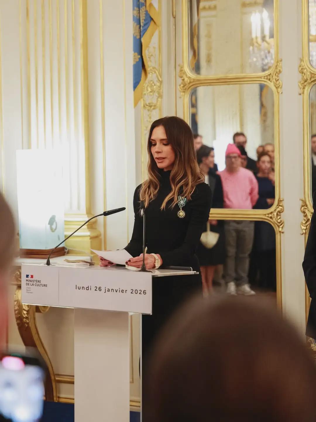 维多利亚·贝克汉姆在巴黎领取时尚大奖时,向她的家人致意。1月26日星期一,在巴黎时装周期间,这位51岁的时装设计师被法国文化部授予艺术与文学骑士勋章。维多利亚与丈夫大卫·贝克汉姆、14岁的女儿哈珀以及20岁的儿子克鲁兹和23岁的儿子罗密欧一同出席了授勋仪式。维多利亚在Instagram上发布了一张包含全家福的照片,并配文称她“很荣幸”获得这份认可。她写道:“...