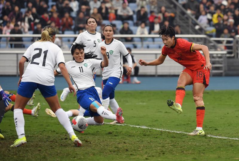 2025年4月5日,永川国际女足锦标赛,中国队球员邵子钦(右一)攻破乌兹别克斯坦队大门。新华社发