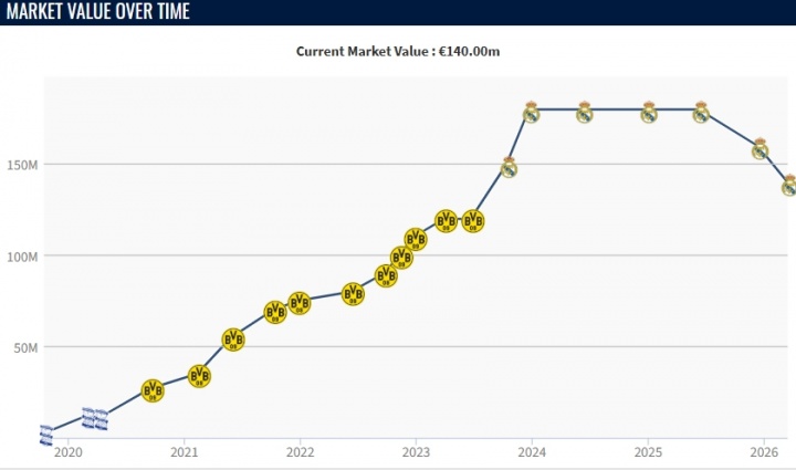 “实际上,去年他的表现就已呈现出下滑趋势。缺乏连续性和在队内角色的频繁变动显然对他造成了不利影响,这导致他暂时失去了在西甲身价前三名中的位置。当然,他完全有机会通过在皇家马德里的表现以及即将到来的世界杯,重新跻身顶尖行列。"