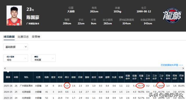 对比到上个赛季的场均6.6分,以及菜鸟赛季的7.4分,有不同程度的下滑,陈国豪的投篮命中率,三分命中率均创造职业生涯的新低。