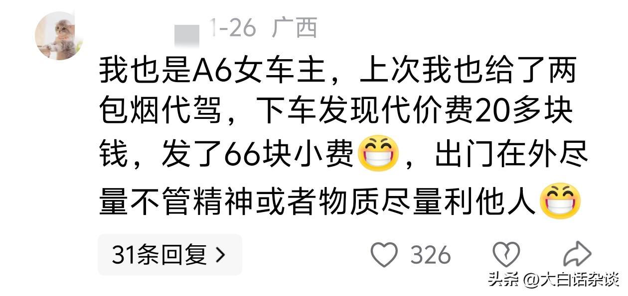 评论区有同行代驾表示,自己也遇到过类似情况,当时代驾费才20多块,没想到女车主后面又发66元红包,他觉得作为代驾尽可能为车主提供精神和物质上的满足,也算是双向奔赴!