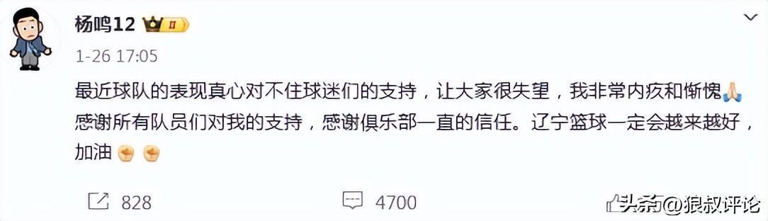 1月26日,辽宁男篮官方社媒发文,杨鸣正式卸任辽篮主帅的位置,对此,杨鸣表示:最近球队的表现真心对不住球迷们的支持,让大家很失望,我非常内疚和惭愧。