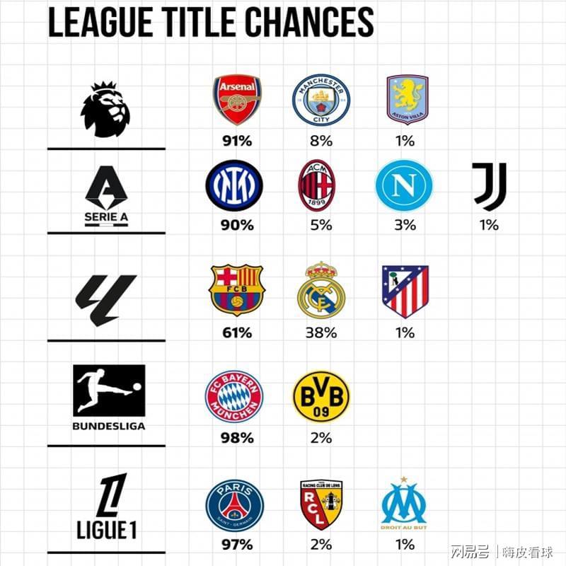 根据《欧洲俱乐部指数》统计机构的分析,欧洲五大联赛中,有4个冠军的争夺基本上没有悬念,均超过九成,巴黎圣日耳曼和拜仁慕尼黑夺冠机会甚至接近百分之一百,真的是这样吗?